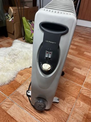 Radiador de aceite portátil con ruedas para facilitar su movilidad. Ideal para calentar estancias. - Diseño compacto y funcional. - Ruedas para transporte. - Panel de control. Le falta una rueda