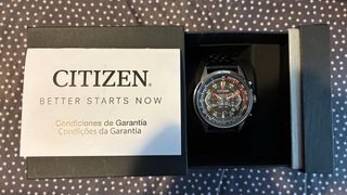 Reloj Citizen Eco-Drive para caballero con cronógrafo. - Esfera negra con detalles en rojo y amarillo. - Correa de piel negra. - Función de taquímetro. - Le queda casi 1 año de garantia oficial. - Completo con caja, garantia y almohadilla.