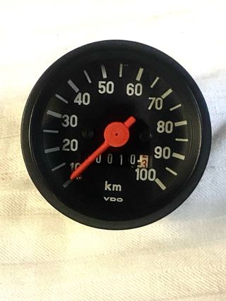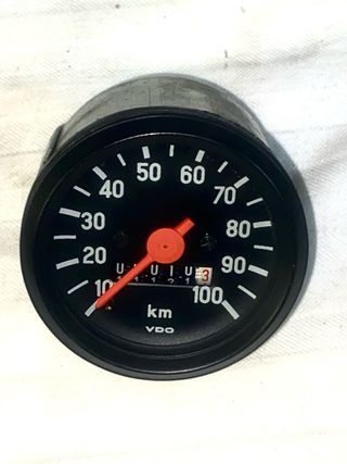 Marcador VDO para vehículos, con una escala de hasta 100 km/h. Adaptable a muchos modelos años ‘70-‘80. - Diseño circular clásico. - Fondo negro con números blancos. - Aguja indicadora de color rojo. - Marca VDO. Clave: 49 50 65 74 75 80 90 100 125 montesa bultaco honda rieju puch derbi peugeot ossa ducati guzzi
