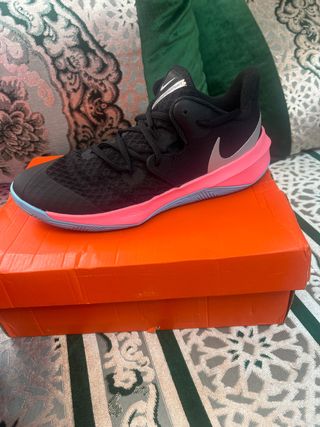 Zapatillas Nike para balonmano y voleibol, completamente nuevas - Color negro con detalles en rosa y azul. - Suela de goma. - Cierre de cordones. Motivo de venta Se la compre a mi hija por 93€,pero le vino muy pequena, y no me dio tiempo en devolver las zapatillas en la fecha correspondiente. La talla es un 40 y medio pero viste a 38 o 38 y medio por eso le vino pequena, pero no se ha utilizado ni usado ni una sola vez, y va con caja.