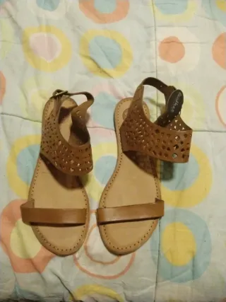 Chanclas de piel en color marrón, talla 37. Perfectas para el verano. .nuevas sin estrenar - Diseño con tiras troqueladas. - Cierre de hebilla ajustable. - Suela cómoda de piel.