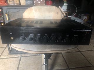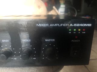 Amplificador mezclador A-5240MB en color negro. Cuenta con controles de graves, agudos y máster. - Indicadores LED de nivel (-18, -10, -6, 0dB). - Botón de encendido/apagado.