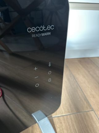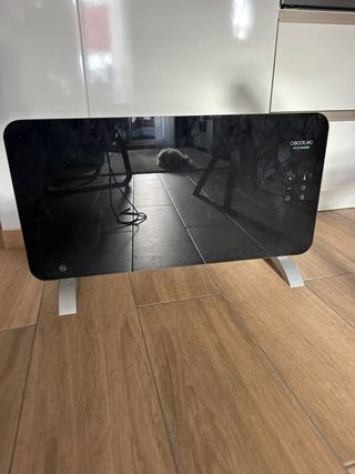 Radiador eléctrico Cecotec con un diseño moderno y elegante. - Panel frontal de cristal negro. - Patas de soporte de metal plateado. - Panel de control táctil con indicadores LED.