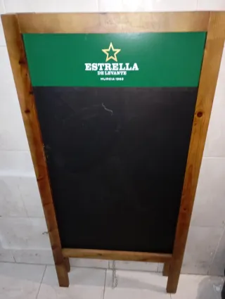Pizarra de estilo industrial con marco de madera. - Superficie de escritura negra. - Detalle superior con logo Estrella de Levante y Murcia 1963.