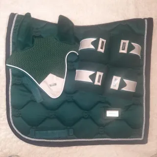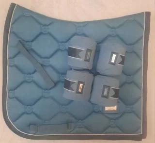 Precioso conjunto de doma para caballo con sudadero,orejeras y vendas trabajo de la marca Equestrian Stockholm. Color Amazonite. Todo talla Full y en muy buen estado.