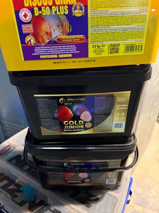 Alimento granulado para peces Discus. - Súper potenciador de color. - Contiene Astaxantina 120 mg y extracto de pimiento rojo. - Peso: 2,2 kg / 5 L. - Fecha de caducidad: 11-2023. Todo junto x 30 €