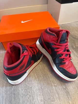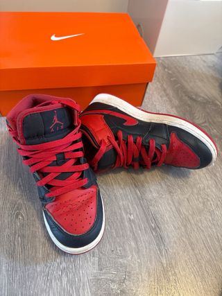 Zapatillas altas Nike Jordan Clasic en talla 36. Combinan negro y rojo para un look deportivo. - Diseño de caña alta. - Cierre con cordones.