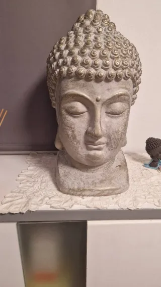 Figura decorativa de cabeza de Buda de gran tamaño. Su diseño detallado aporta un toque de serenidad y estilo a cualquier espacio. - Acabado en tonos piedra y dorado. - Detalles ornamentales en la cabeza. Medidas: 42x24x24