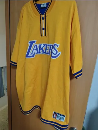 Camiseta de calentamiento de los Lakers de Los Ángeles, marca Champion. Ideal para fans del equipo. - Color amarillo vibrante. - Logo de los Lakers en el pecho. - Cuello tipo polo con botones. - Mangas cortas con detalles en azul y blanco. - Etiqueta oficial NBA.