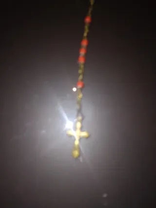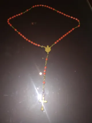 Precioso rosario antiguo con cuentas de coral y detalles dorados. Ideal para devoción o como pieza decorativa. - Cuentas de color rojo. - Colgante con cruz dorada. - Cadena dorada. Tiene aproximadamente 80 años.
