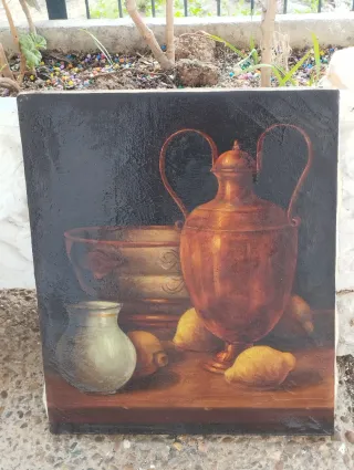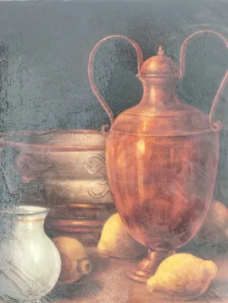 Oleo sobre lienzo. Representa una composición clásica con recipientes y frutas. - Técnica: Óleo sobre lienzo. - Elementos: Jarrones y limones.