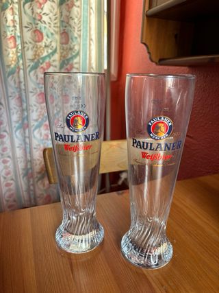 Set de dos vasos de cerveza Paulaner. - Diseño con relieve en la base. - Logo de Paulaner y Weißbier impreso.