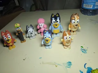 Lote de 8 figuras de personajes de Bluey. - Incluye varios personajes de la serie. - Figuras de plástico. - alguno le falta la ceja.