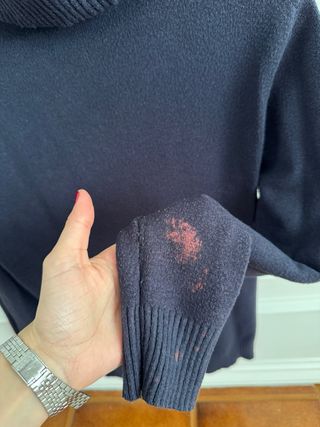 Jersey de cuello alto en color azul marino. Una prenda básica y versátil. - Cuello alto acanalado. - Puños y bajo elásticos. - Tiene algunas manchas de lejía. - Tela un poco más gordito, no es fino. - Es un poco entallado.