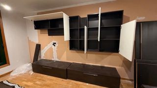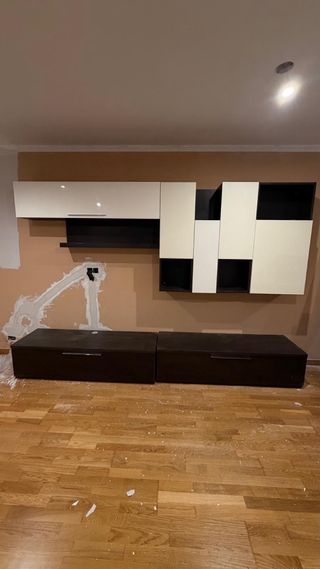Conjunto de muebles de salón en color bengue y blanco brillo compuesto de: -Aparador 180 m. de largo y 50cm de ancho -Conjunto de dos muebles tv con puerta y estante interno. Largo total 3m. -Mueble suspendido con puertas y estantes internos. Largo total 3 m. Largo total del mueble de la tele y del mueble suspendido 3m. Todo ello en muy buen estado muy cuidado y se vende por reforma integra del piso.