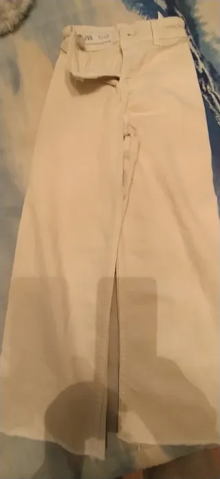 Pantalón vaquero de niña de la marca Zara. - Color beige. - Corte ancho. - Bajo deshilachado.
