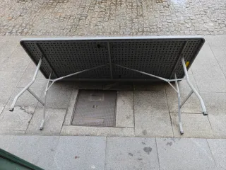 Conjunto de siete mesas rectangulares plegables. Son ideales para eventos, reuniones o como mobiliario extra. - Medidas: 183 cm de largo x 75 cm de ancho. - Estructura robusta y fácil de plegar. - Usadas solo en un evento Costaron 50eur cada una, 350eur.