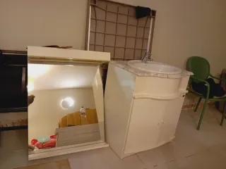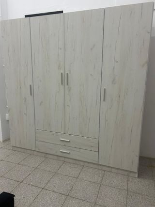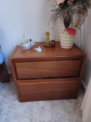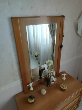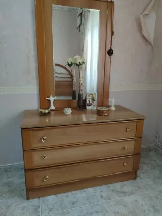 Conjunto de dormitorio en madera de roble. Incluye cama con colchón nuevo de 135cm, mesita de noche y cabecero y cómoda con espejo. - Cama de madera con somier. Medidas:192x140 - Mesita de noche con dos cajones. Medidas: 60x38x50cm - Comoda medidas: 110x38x66cm - Espejo: 60x 110