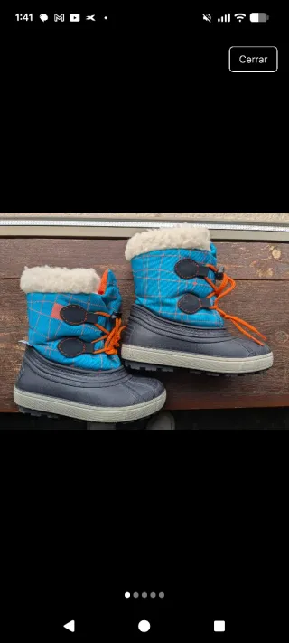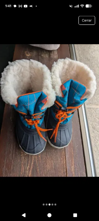 Botas de invierno para niño con forro interior de pelo, puestas 4 veces, marca Elementerre, en muy buen estado. - Parte superior azul con cuadros. - Detalle de cordones naranjas. - Cierre con dos botones. - Suela de goma antideslizante.