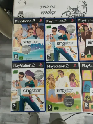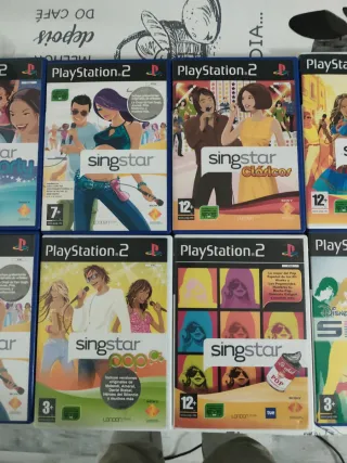 Pack de juegos Singstar para PlayStation 2. Todos los cd completos en español Incluído los dos micros en buen estado y el adaptador. Todo incluído