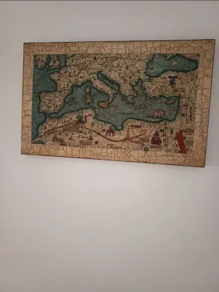 Reproducción artística en madera de un fragmento del famoso Atlas catalán creado por Abraham Cresques en 1375. Representa la zona del mar mediterráneo con gran detalle, incluyendo ciudades, símbolos y rutas de navegación medievales. Impredi sobre madera con efecto envejecido craquelado.