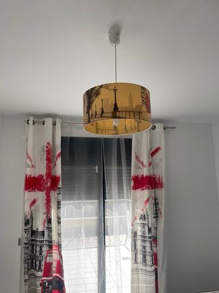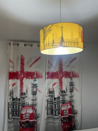 Lote de lámpara colgante y cortinas con diseño de Londres. El conjunto incluye una barra para cortinas. - Lámpara con estampado de farolas y Big Ben. - Cortinas con diseño de la Union Jack y monumentos de Londres. - Barra de metal para colgar las cortinas.