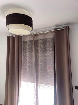 Conjunto de lámpara de techo y cortinas en tonos marrones. La lámpara tiene un diseño moderno con dos niveles y detalles en color oscuro. Las cortinas son opacas y vienen con su barra. - Lámpara con estructura de tela y metal. - Cortinas de tela con barra metálica.
