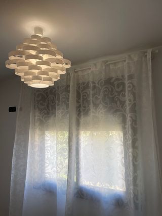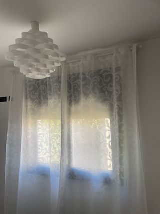 Conjunto de lámpara de techo y cortinas con barra. - Lámpara con diseño moderno. - Cortinas con estampado floral.