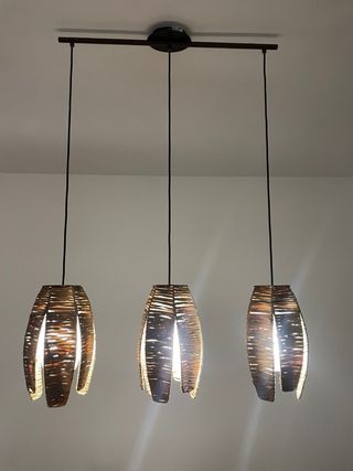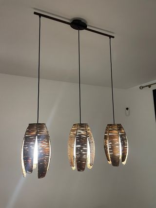 Elegante lámpara colgante de tres luces, perfecta para dar un toque natural a tu comedor. Su diseño orgánico y materiales combinados crean un ambiente cálido y acogedor. - Estructura con acabado en ratán y detalles en madera. - Tres pantallas colgantes con diseño abierto.