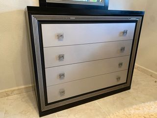 Conjunto de muebles de dormitorio compuesto por un sinfonier y dos mesitas de noche. - Diseño moderno con acabados en negro y plateado. - Tiradores cuadrados metálicos. Medidas del sinfonier: apartado de medidas. Medidas mesitas de noche: -45,5cm (ancho)- 36 cm (fondo) -54 cm (alto)