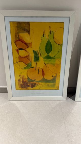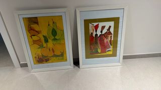 Dos cuadros decorativos con marcos de madera y láminas de papel. - Un cuadro con diseño de frutas y formas abstractas. - Otro cuadro con figuras humanas estilizadas y detalles coloridos.