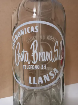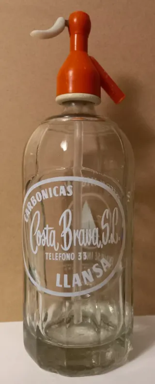 Sifón de vidrio para bebidas carbonatadas de la marca Costa Brava, con origen en Llansa. - Botella de vidrio transparente. - Dispone de dosificador naranja y blanco.