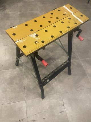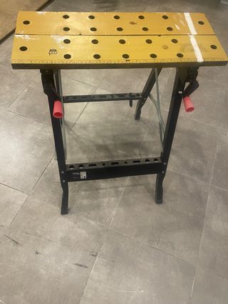 Cuenta con dos mordazas integradas, tablero con agujeros para fijación y estructura metálica plegable, fácil de guardar. Estable y práctica para uso en casa o garaje. Presenta marcas normales de uso (ver fotos), funcionando correctamente.