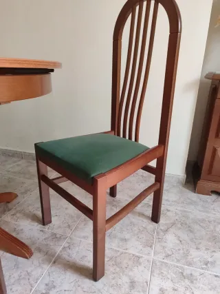 Conjunto de mesa de comedor redonda de madera con cuatro sillas a juego. Las sillas tienen asientos tapizados en verde. Mesa extensible hasta 1.37m y sin extender 1m 4 Sillas medida, ancho 44cm y alto 109cm - Mesa redonda de madera. - Cuatro sillas de madera. - Asientos de sillas en tela verde.