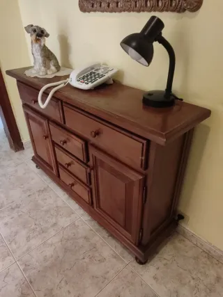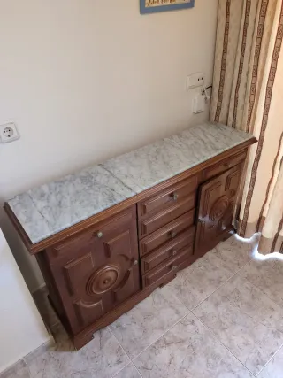 Mueble recibidor con una superficie de mármol y estructura de madera. - Diseño clásico con detalles tallados. - Amplio espacio de almacenamiento con cajones y puertas. - Acabado en tono madera cálido. Falta un tirador