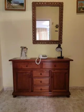 Mueble de recibidor con un espejo decorativo, el espejo es imitación madera y sus medidas son 65x85cm. - Acabado en madera oscura. - Incluye cajones y puertas para almacenamiento.