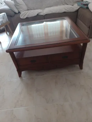 Elegante mesa de centro con un diseño clásico y funcional. Combina la calidez de la madera con la transparencia del cristal para crear un punto focal en tu salón. - Encimera de cristal. - Estructura de madera. - Dos cajones con tiradores.