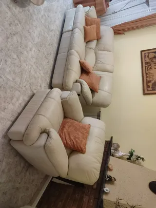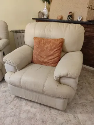 Conjunto sofá 3 plazas con una butaca individual, es polipiel en color veis, los cojines incluidos. Las medidas de la butaca individual son 105x105cm Hay la opción reposapiés aunque está un poco dañado.