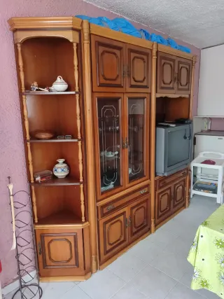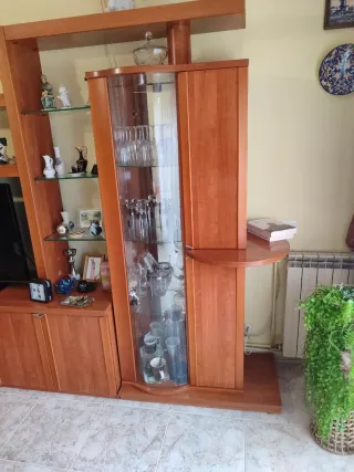 Mueble de comedor con un diseño elegante y funcional. Esta en muy buen estado. Con dos vitrinas con puertas de cristal. - Estructura principal de madera. - Detalles y estantes de cristal. - Acabado en color marrón.