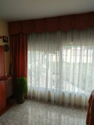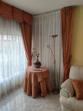 Conjunto de cortinas y mesa auxiliar en tonos naranjas y blancos. - Cortinas con caída y diseño estampado. - Mesa redonda con mantel. Medidas cortinas: 260x150 las pequeñas del lateral 260x 320 las cortinas del ventanal grande. La mesa auxiliar las medidas son 70x 75cm de altura.