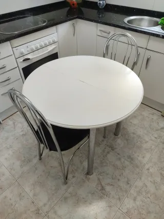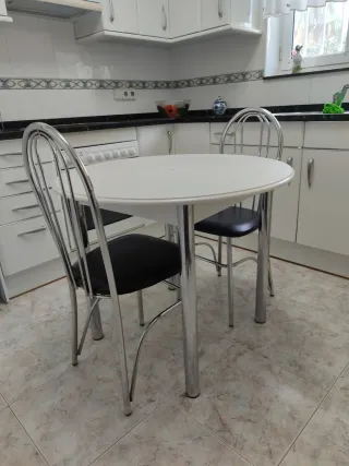 Conjunto de mesa redonda para cocina con dos sillas. Ideal para espacios pequeños. Medida sin extender 90cm y extensible a 115cm - Tablero de madera. - Patas y estructura de metal.