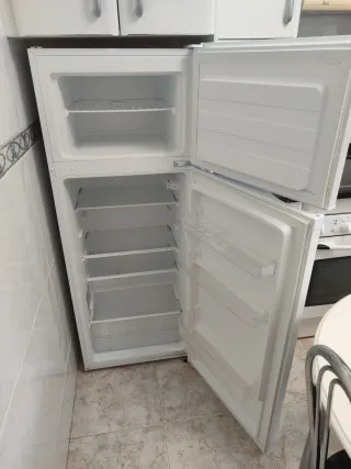 Nevera blanca de dos puertas, ideal para cocinas. En la foto se ve el desgaste exterior pero funciona perfectamente. - Diseño clásico y funcional. - Color blanco.