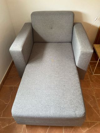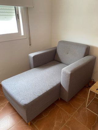Cómodo chaiselongue de tela, perfecto para relajarse. - Diseño moderno. - Patas de madera. La parte donde te estiras tiene un poquito de desgaste debido a enganchones, no afecta a nada a su uso.