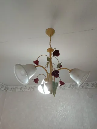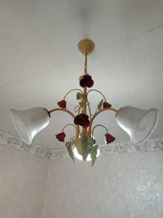 Lámpara de techo con un diseño floral. Medidas: 65x44 - Estructura metálica dorada. - Adornada con rosas rojas. - Hojas decorativas verdes. - Pantallas de cristal.