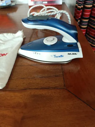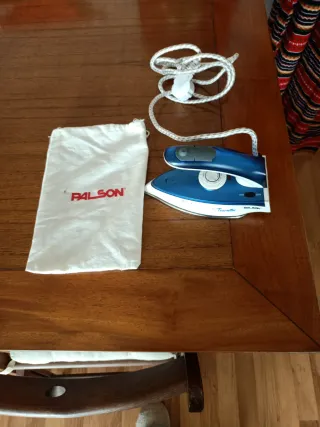 Plancha de viaje de la marca PALSÓN, ideal para llevar contigo a cualquier lugar. Incluye una bolsa de tela para guardarla. - Color azul y blanco. - Diseño compacto.
