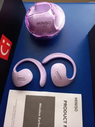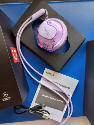 Auriculares inalámbricos Miniso X15 Pro con un diseño moderno y compacto. Incluyen un cable de carga USB-C y un manual de usuario. - Estuche de carga con colgante. - Diseño ergonómico para mayor comodidad. - Indicador de batería de larga duración. Auriculares abiertos: los auriculares Bluetooth de oreja abierta no necesitan insertarse en los oídos, por lo que tus oídos siempre están abiertos, lo que te permite mantenerte conectado con el entorno circundante mientras disfrutas de la música, y puedes detectar posibles peligros a tiempo. Son muy adecuados para su uso durante deportes, conducción o trabajo. Sonido estéreo de alta calida