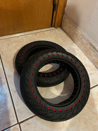 Vendo dos ruedas completamente nuevas sin usar. 25cm largo y ancho y 18cm de diámetro. - Color negro con detalles en rojo. - Diseño con banda de rodadura. - Material resistente.