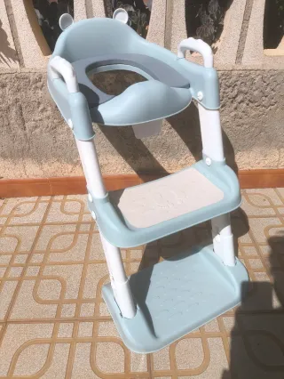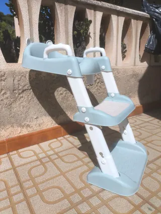 Escalera de entrenamiento para orinal de bebé, diseñada para facilitar la transición al inodoro. - Asiento de orinal con respaldo y orejitas. - Escalones ajustables en altura. - Pasamanos de seguridad. - Diseño plegable para fácil almacenamiento. - Fácil de limpiar.