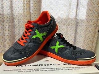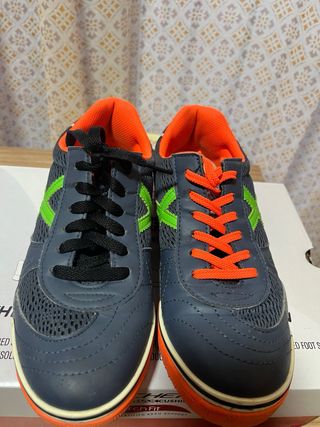 Zapatillas de futsal Munich en talla 38. Combinan un diseño moderno con detalles llamativos. - Parte superior de malla y material sintético. - Suela de goma naranja. - Cordones naranjas y negros. - Detalle de logo 'X' en verde lima.