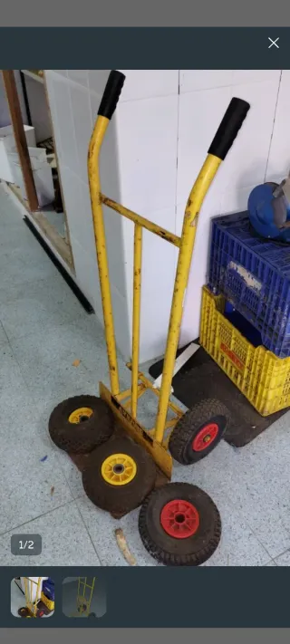 Carro industrial de color amarillo, ideal para transporte. - Estructura metálica. Dos carros industriales A 10€ cada uno Los carritos se entregan como están, no se reparan antes ni tengo más repuestos ni ruedas de recambio ni parches ni hinchador. Las ruedas necesitan ser hinchadas y quizá también reparararse.